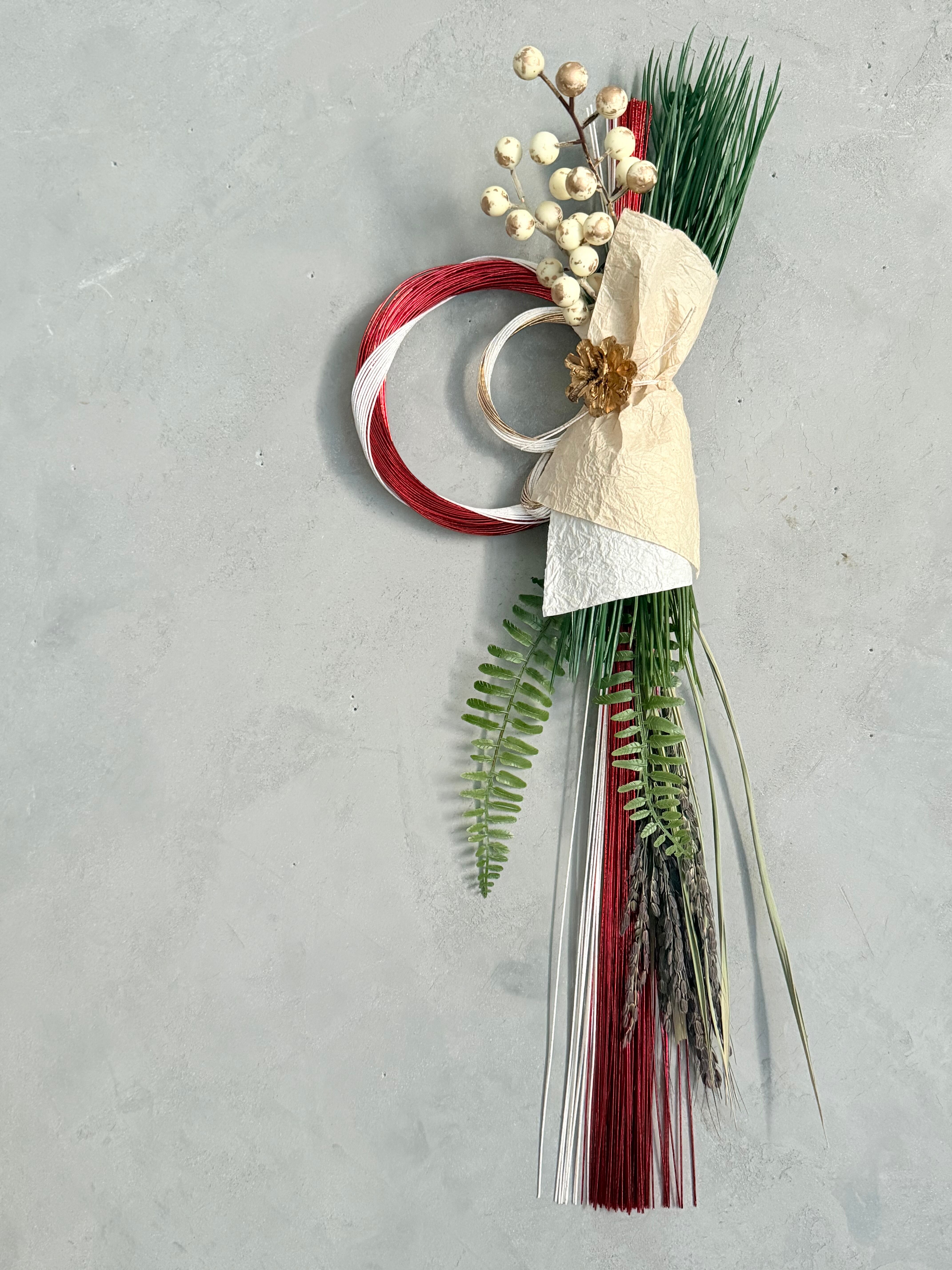 赤白の水引に黒米の稲穂、ゴールドの松笠、造花(アーティフィシャルフラワー )の若松やシダ、白ゴールドの実をシンプルにアレンジしたお正月飾りです。
