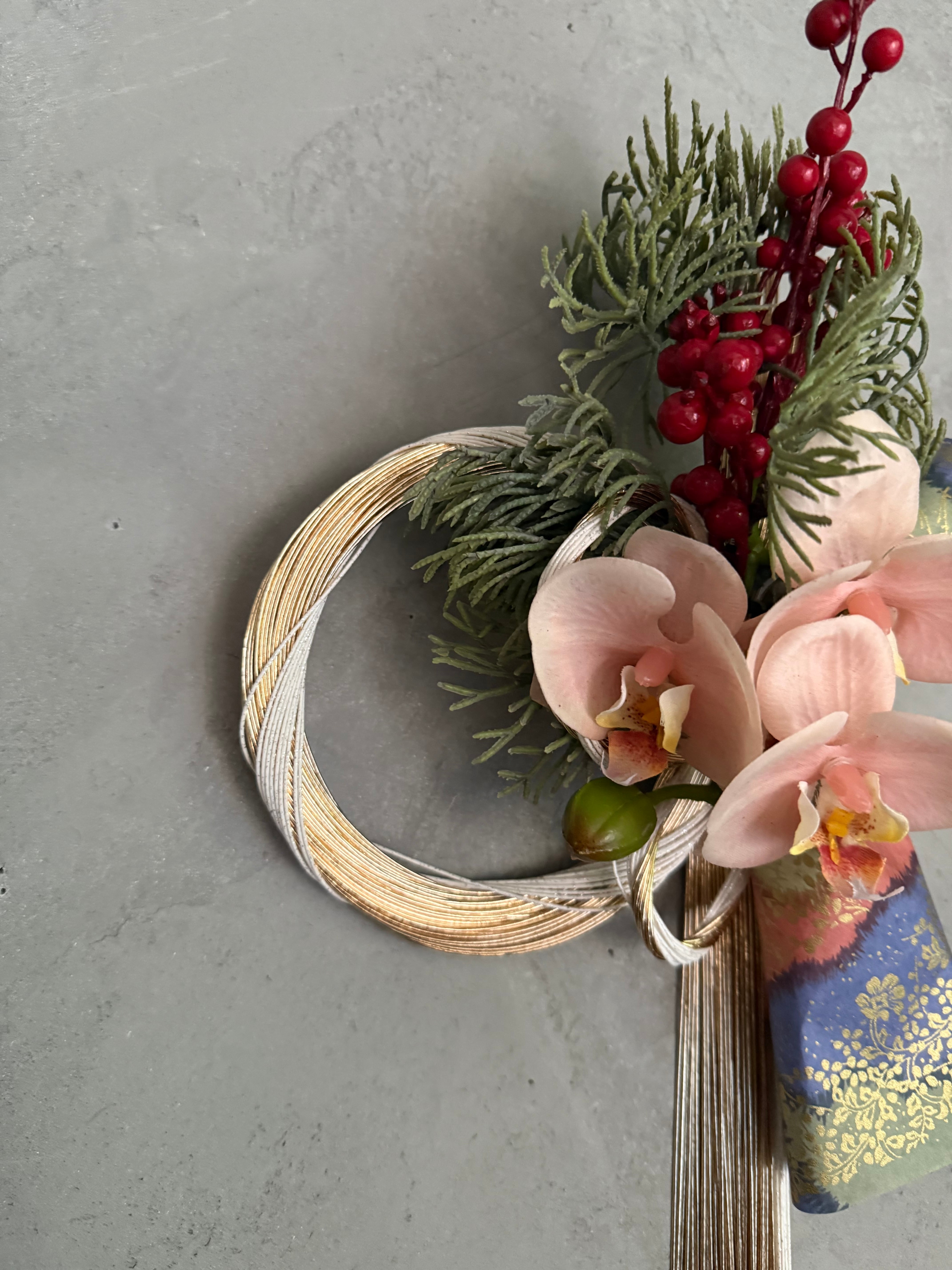 ゴールドと白の水引に、造花(アーティフィシャルフラワー)の胡蝶蘭と実を合わせ、和紙がポイントの華やかなお正月飾りです。