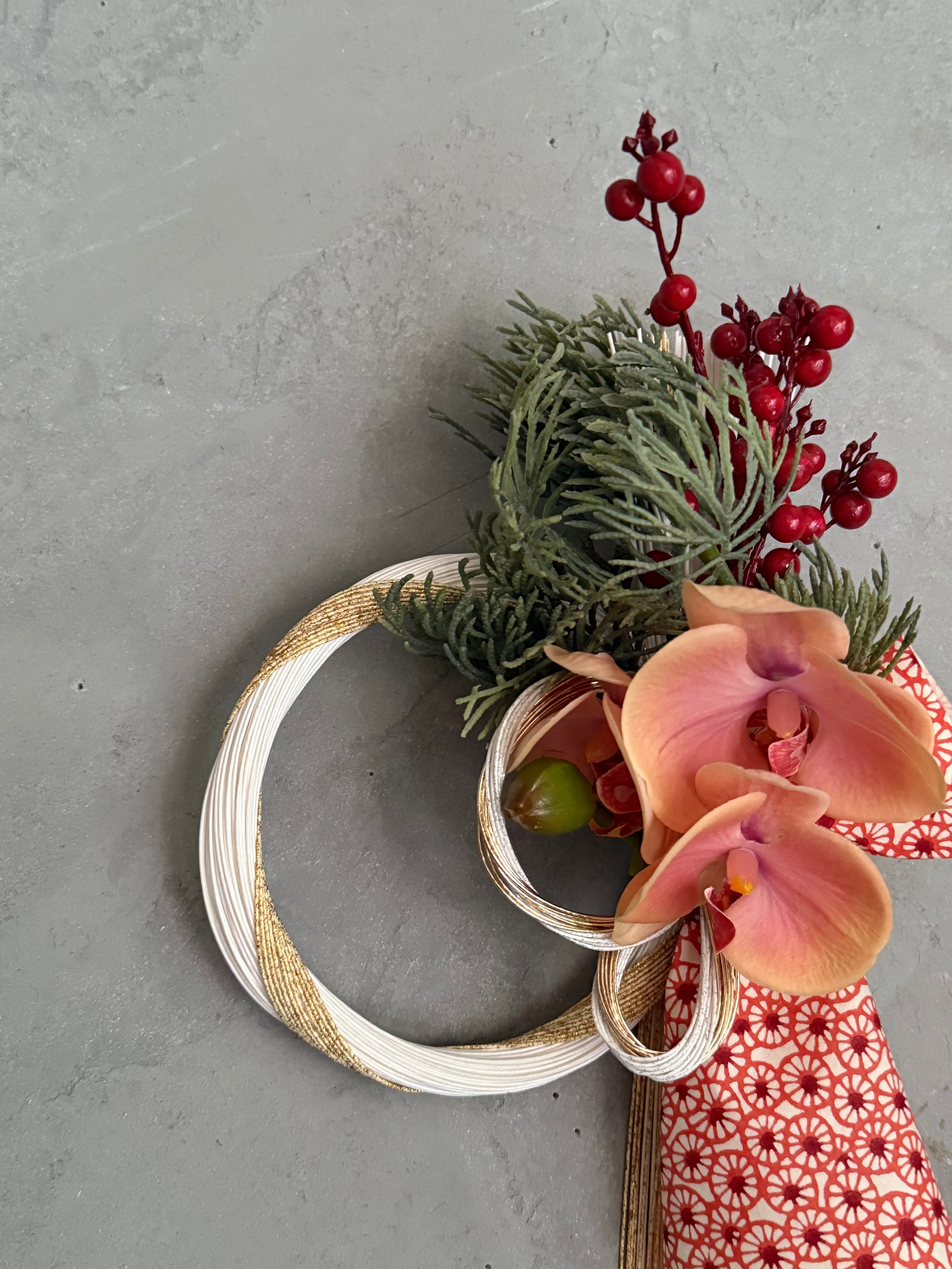 ゴールドと白の水引に、造花(アーティフィシャルフラワー)の胡蝶蘭と実を合わせ、和紙がポイントの華やかなお正月飾りです。