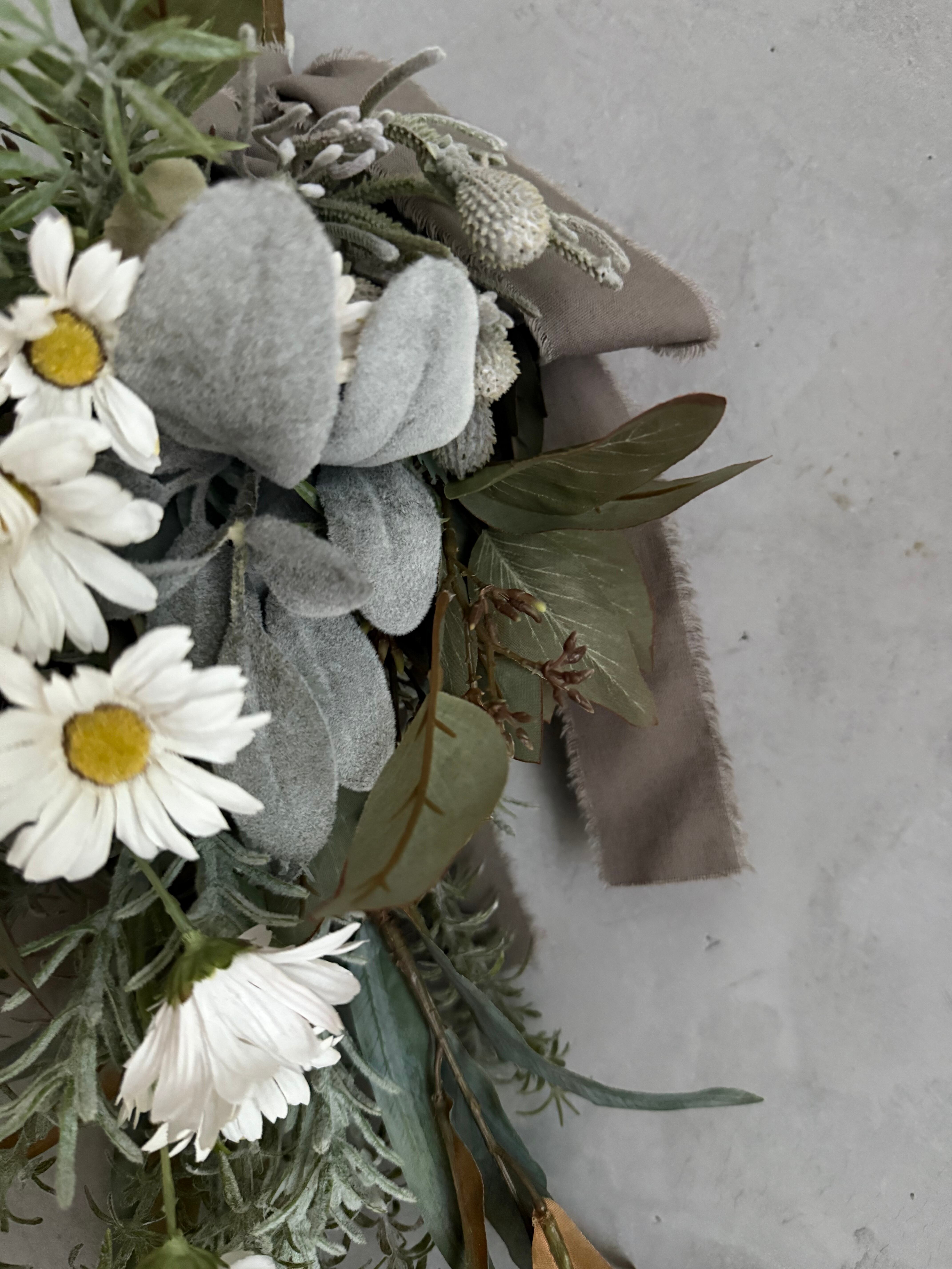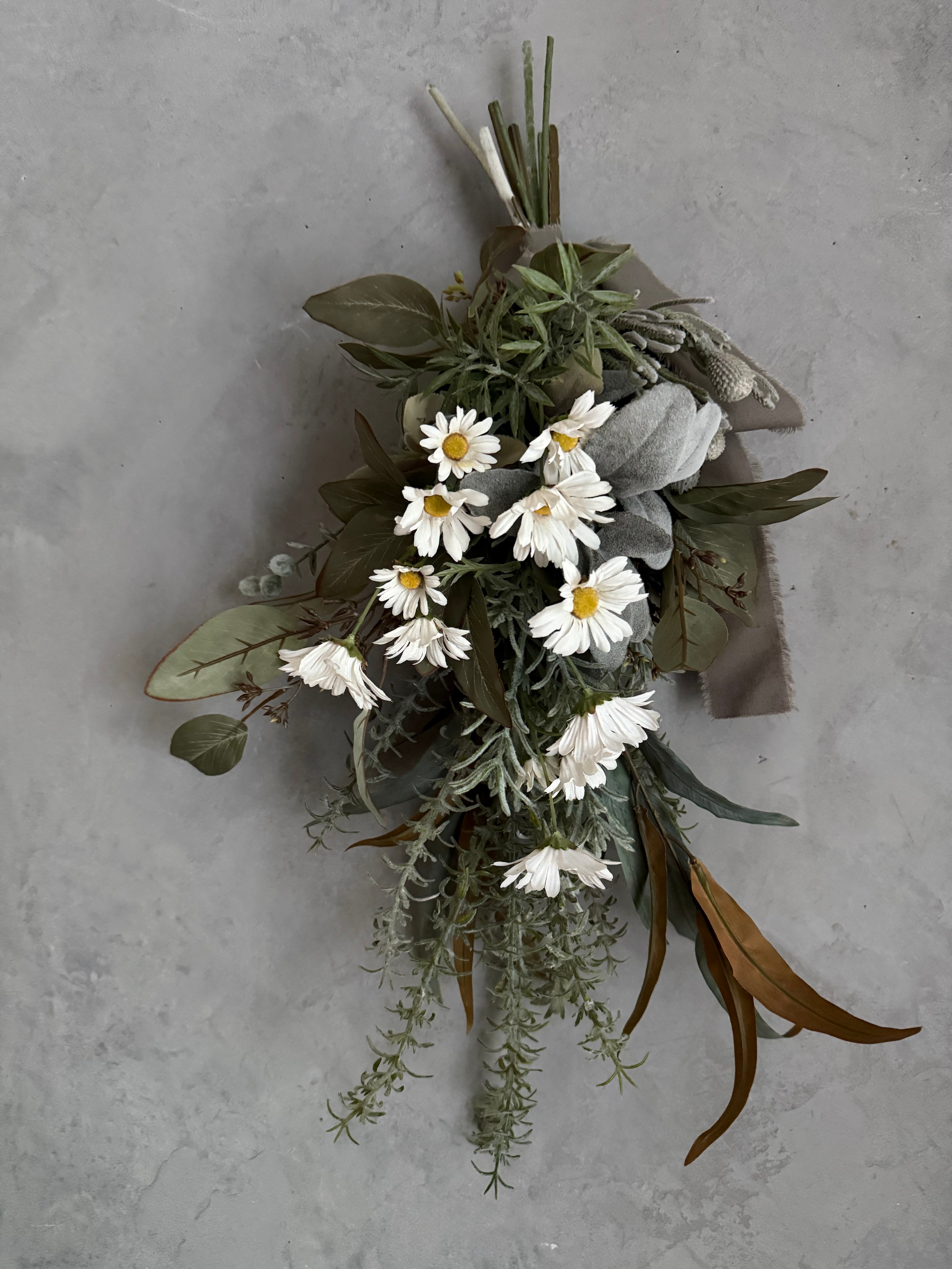 草原でマーガレットとシルバーリーフを摘んで束ねたイメージのシンプルなスワッグアレンジです。