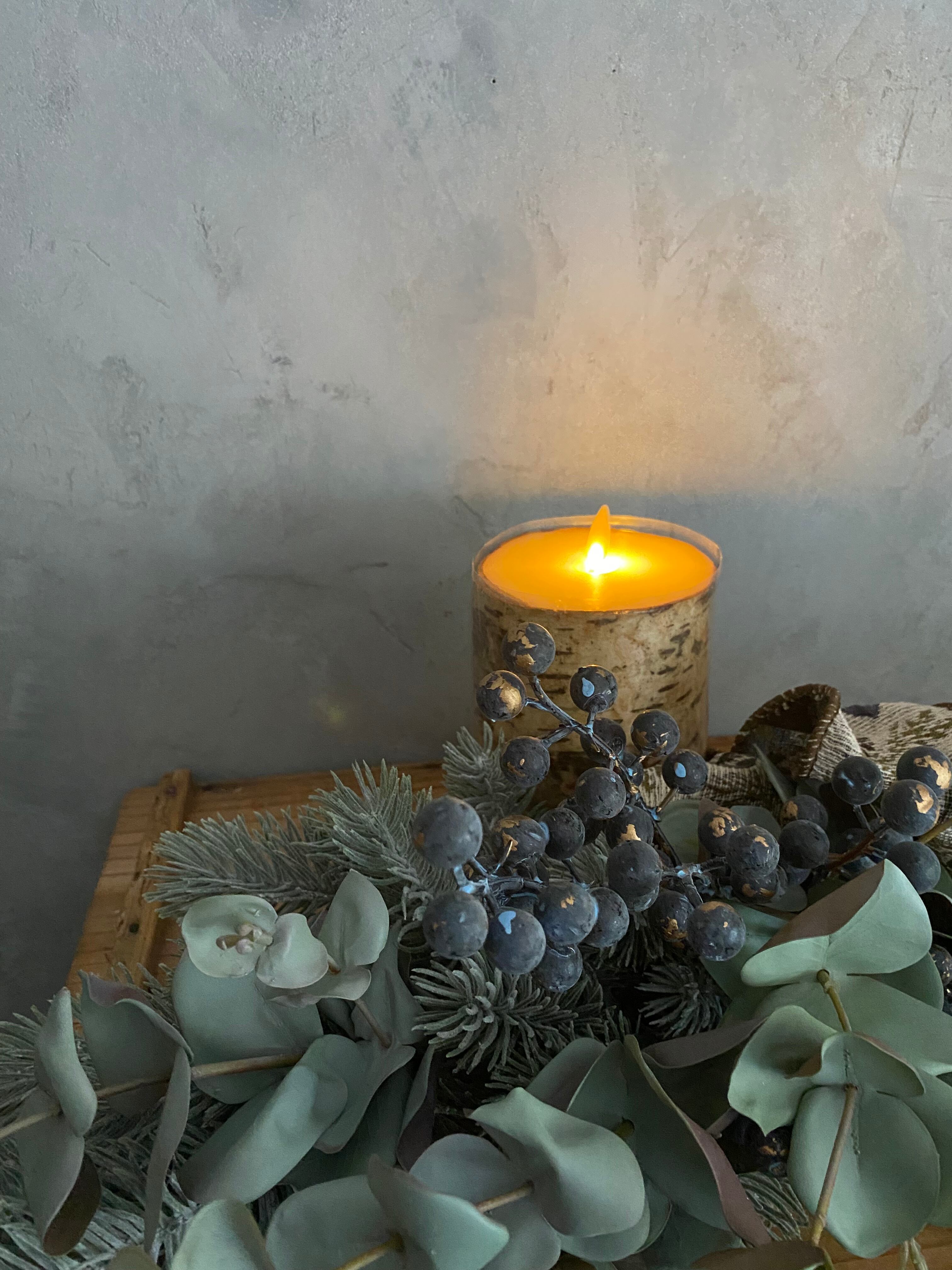 スモーキーカラーのモミと2種類のユーカリに、ベリーとゴブラン柄のリボンがポイントのシックでシンプルな造花のクリスマススワッグです。
