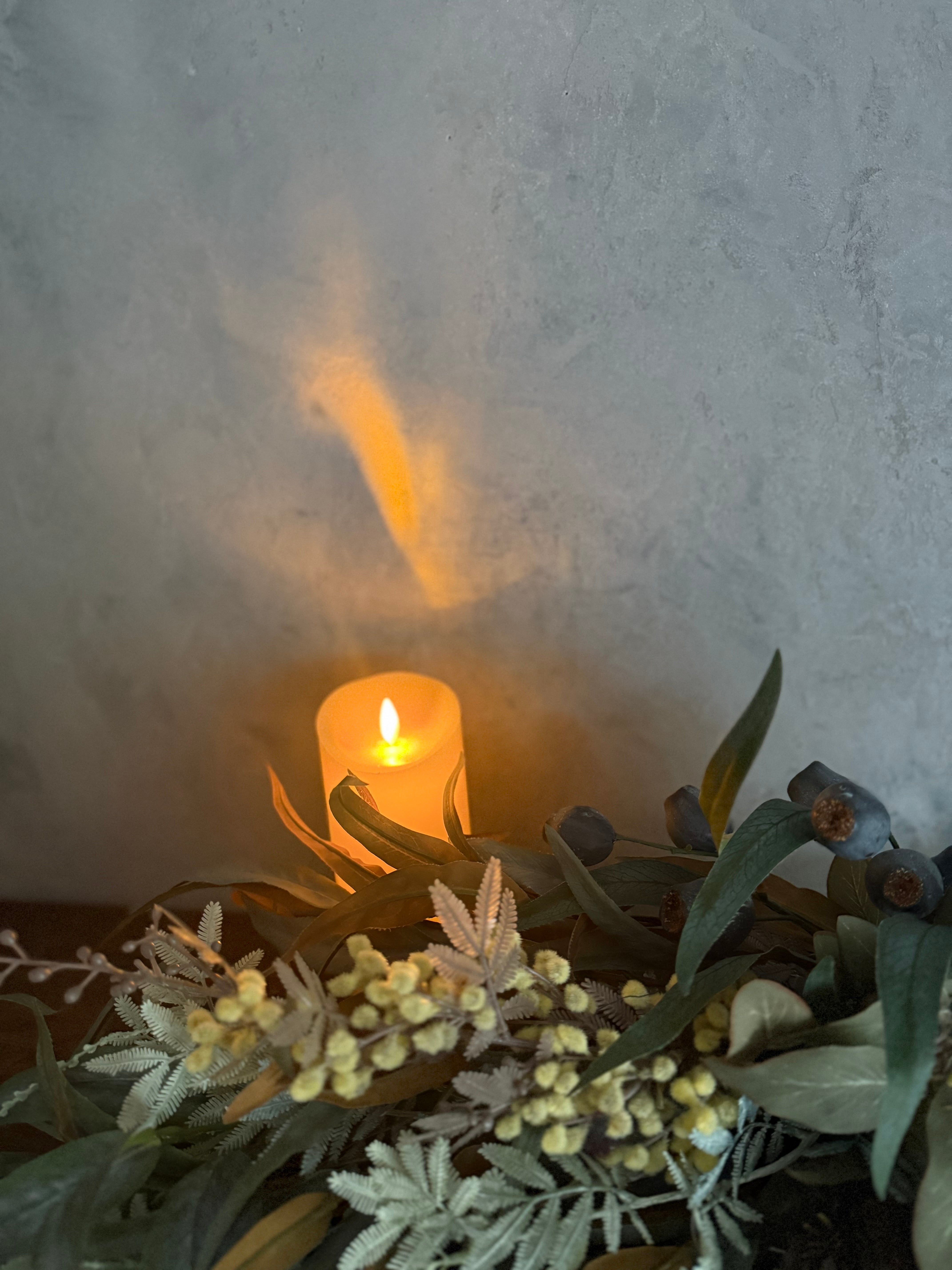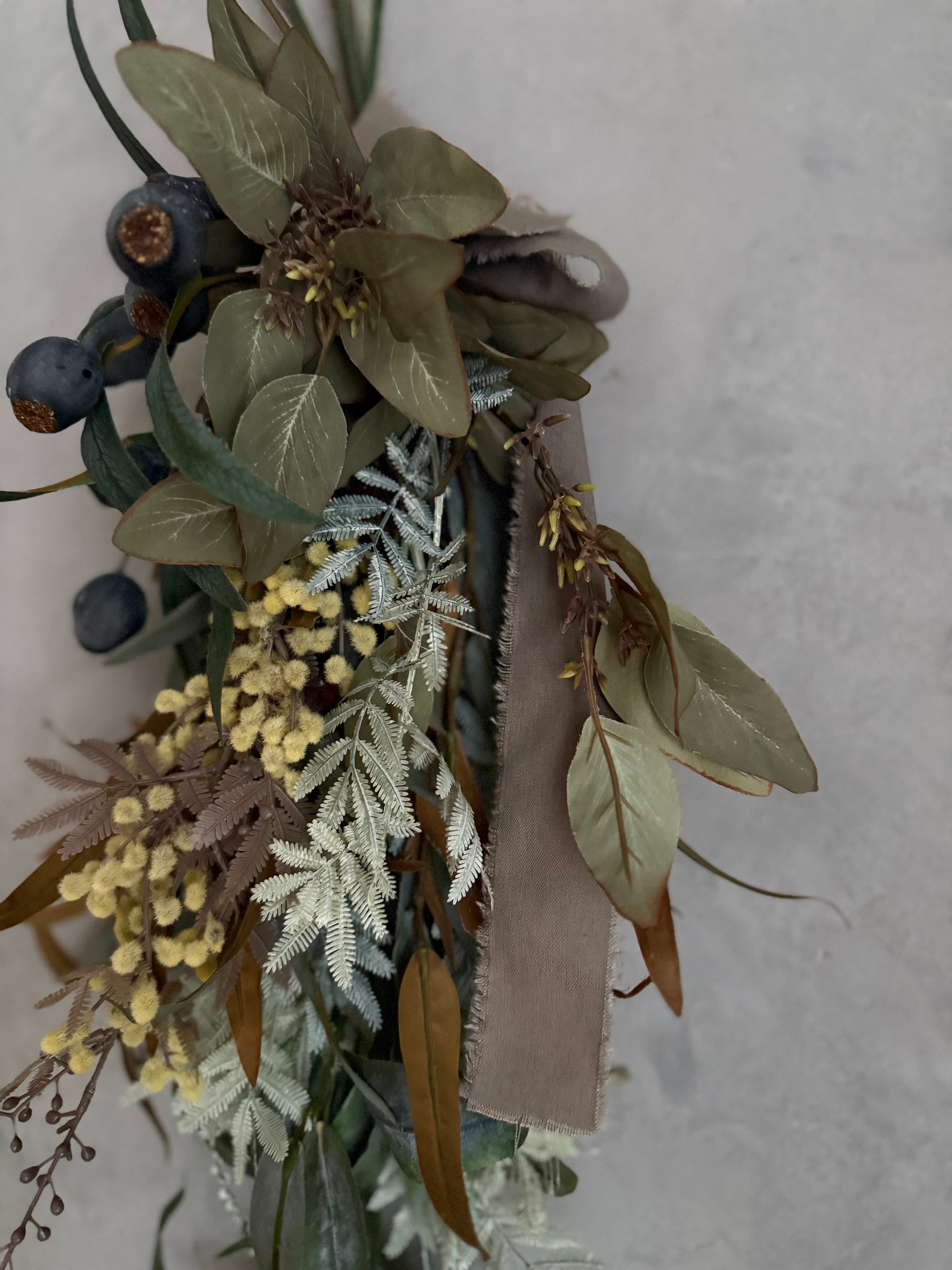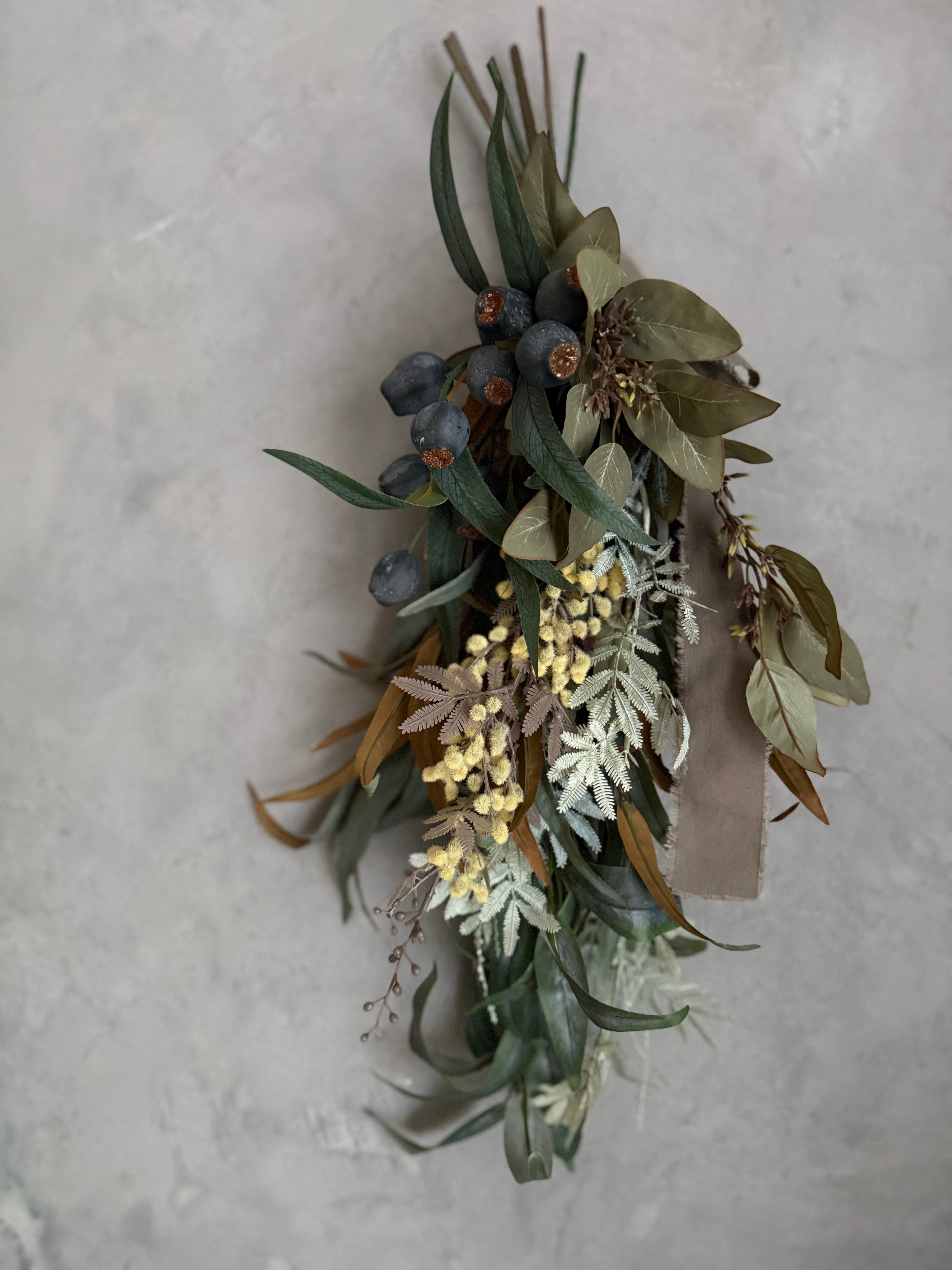 アンティーク色のミモザと数種類のユーカリを合わせたシンプルな造花のスワッグ。