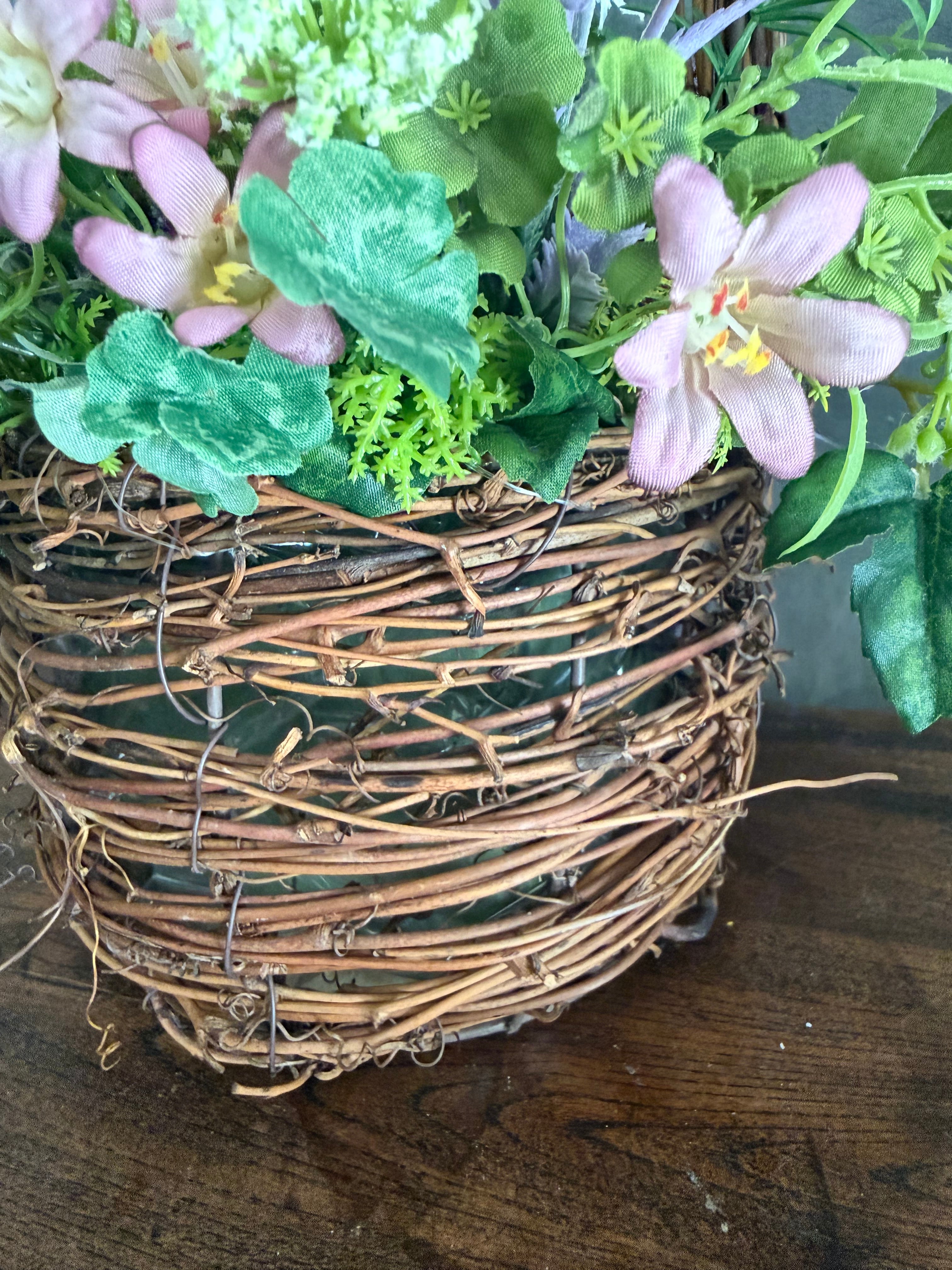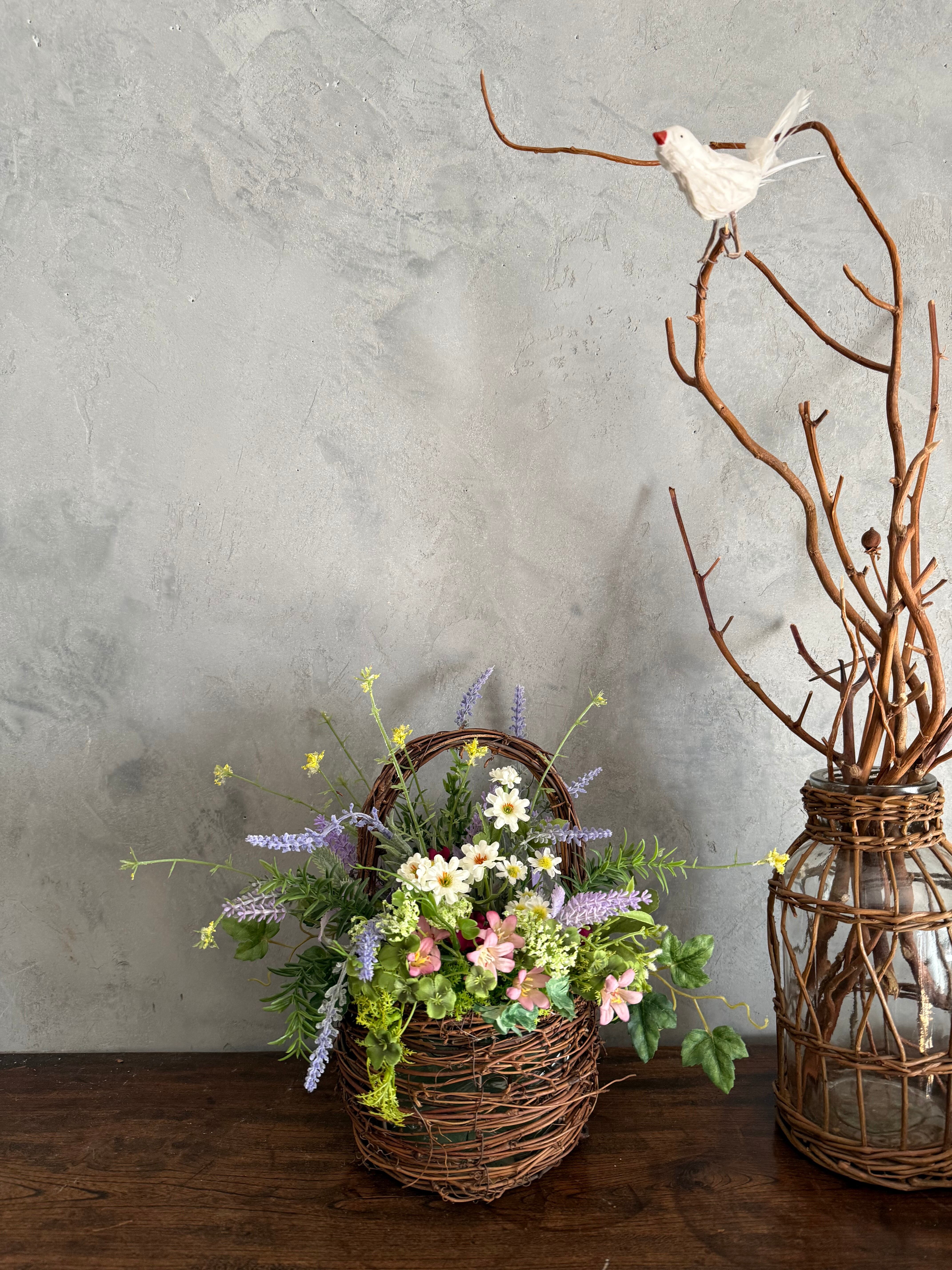 造花(アーティシャルフラワー)のハーブとラベンダーのバスケットアレンジ