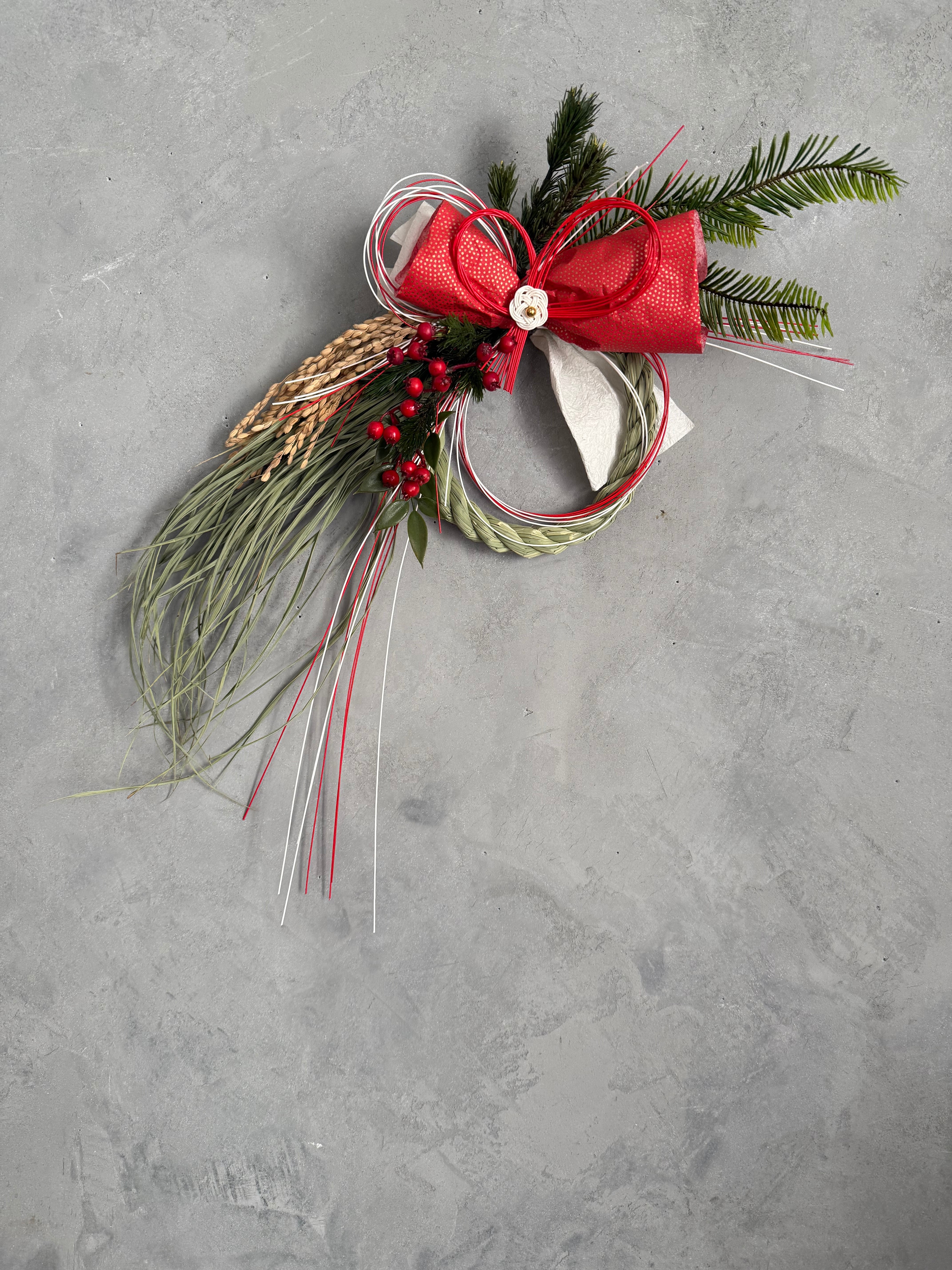 *丸型にデザインしたしめ縄と稲穂の土台に、造花(アーティフィシャルフラワー )の松、南天、シダ、でアレンジしました。