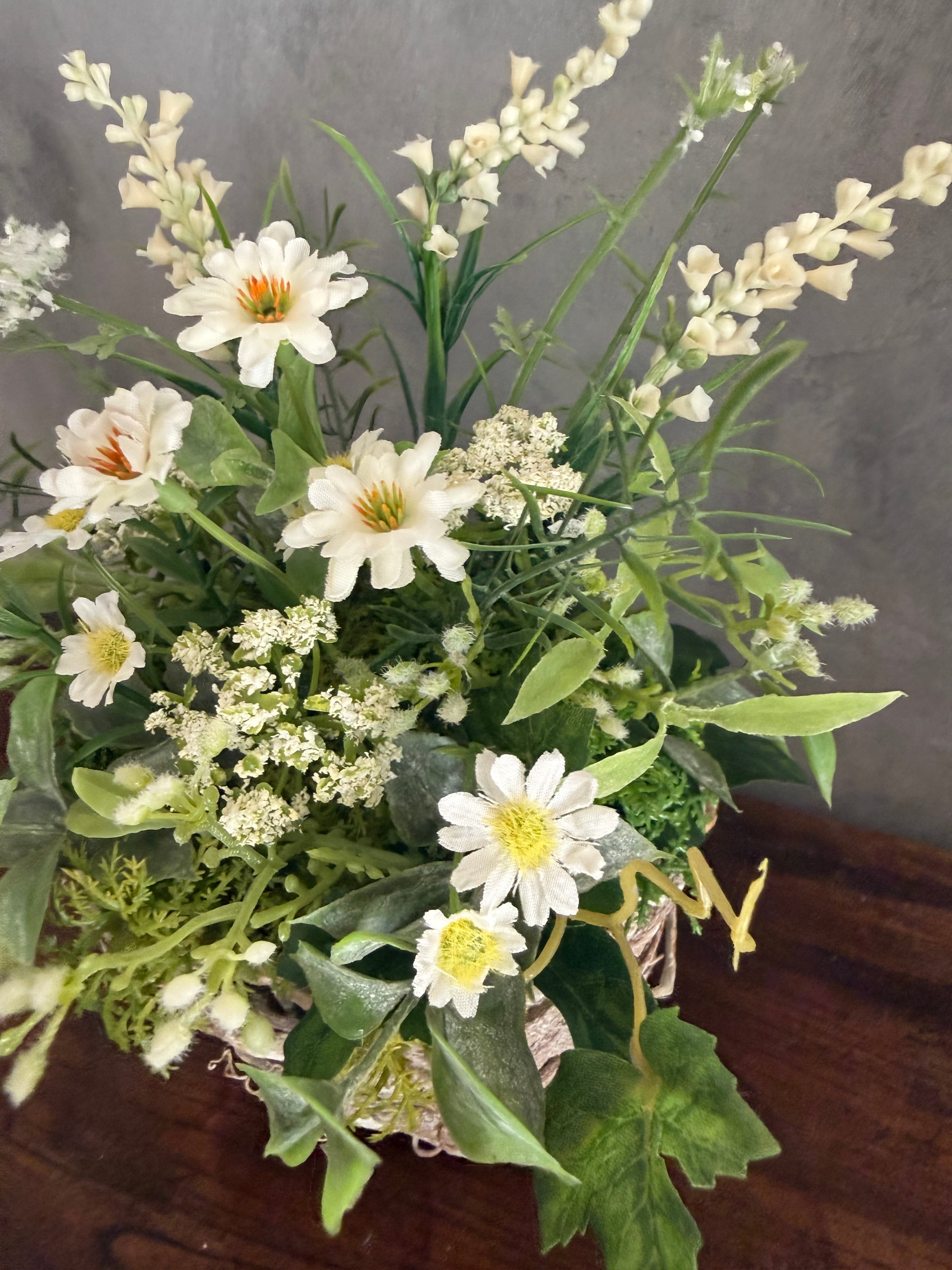 造花(アーティシャルフラワー)のホワイトグリーンの野草のバスケットアレンジ