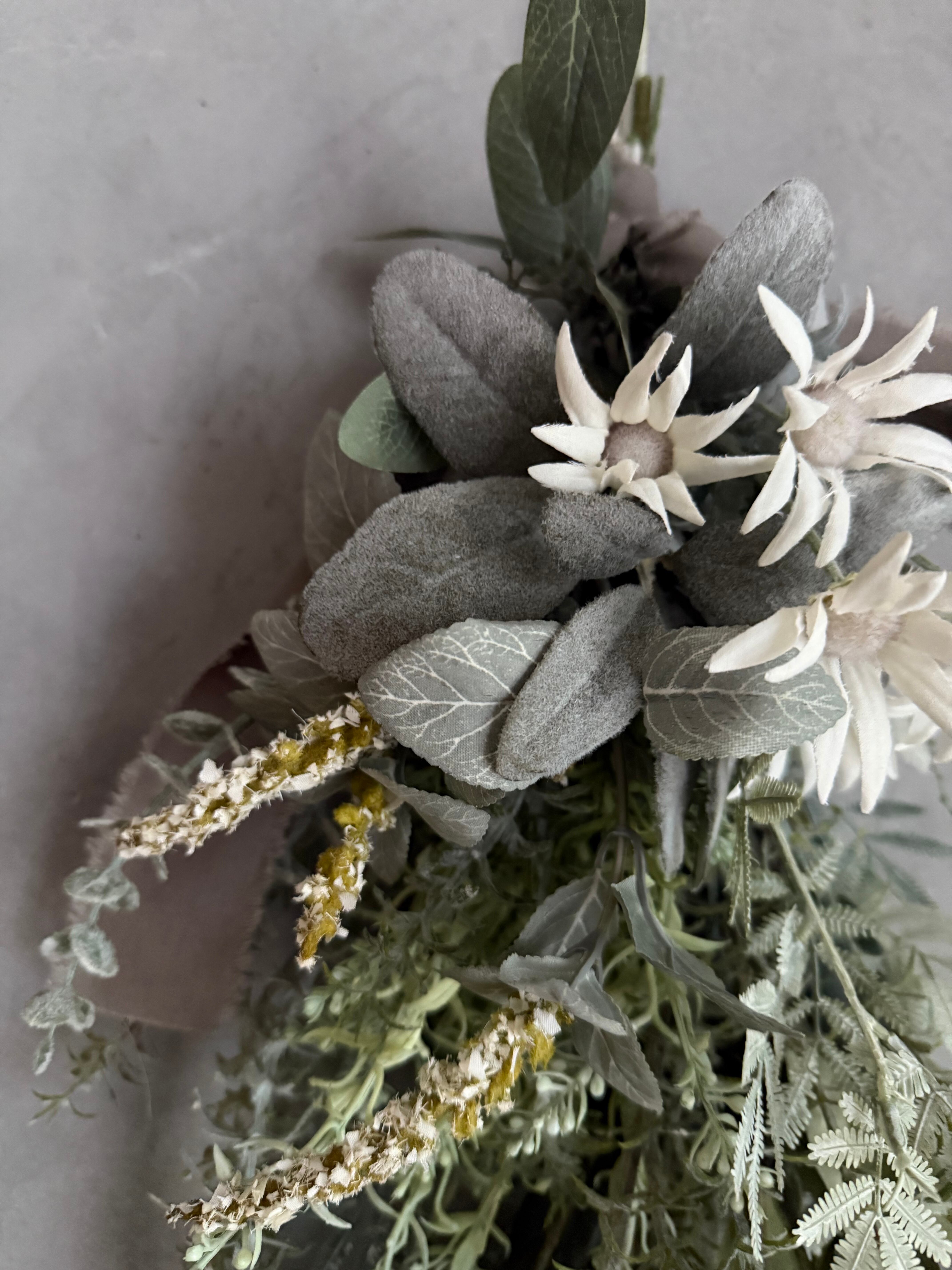 草原でフェンネルおシルバーリーフを摘んで束ねたイメージのスワッグアレンジです。
