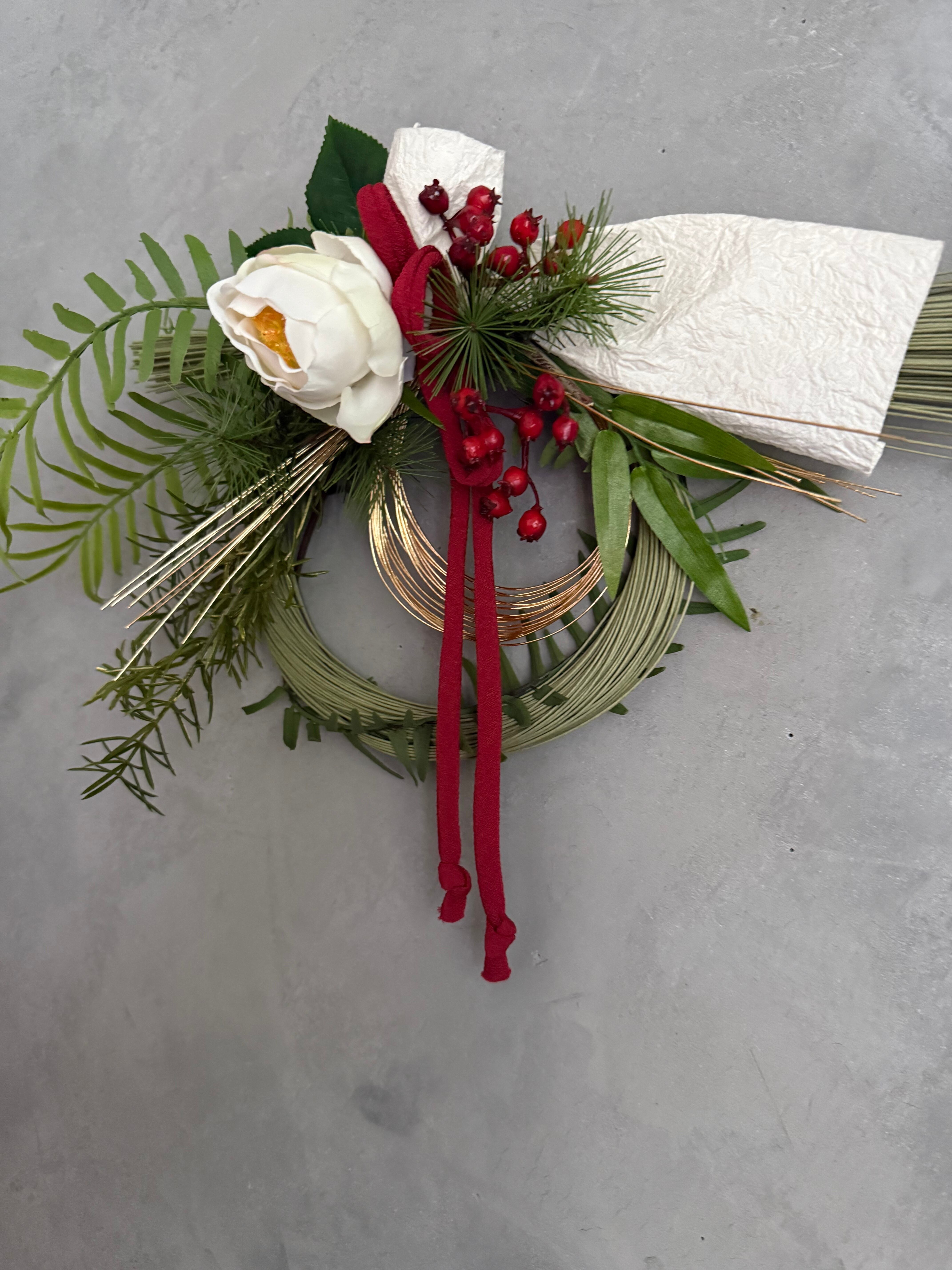 ナチュラルな結び水引に、造花(アーティフィシャルフラワー )の椿・松・シダ・南天の実・をアレンジし、生成りの和紙とちりめん紐を合わせたシンプルなお正月飾りです。